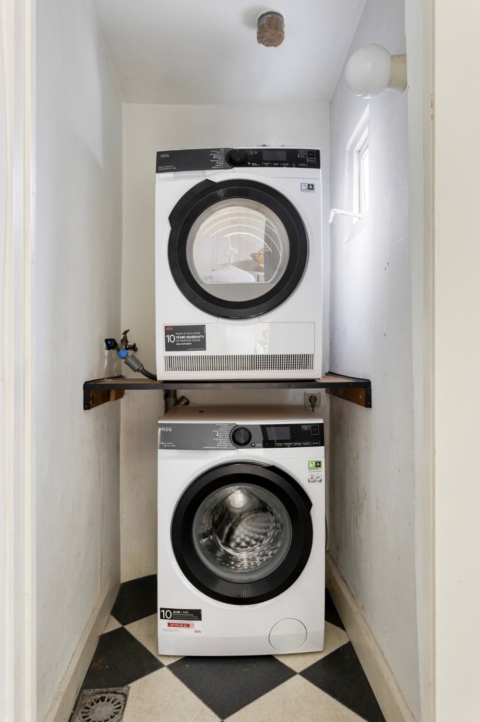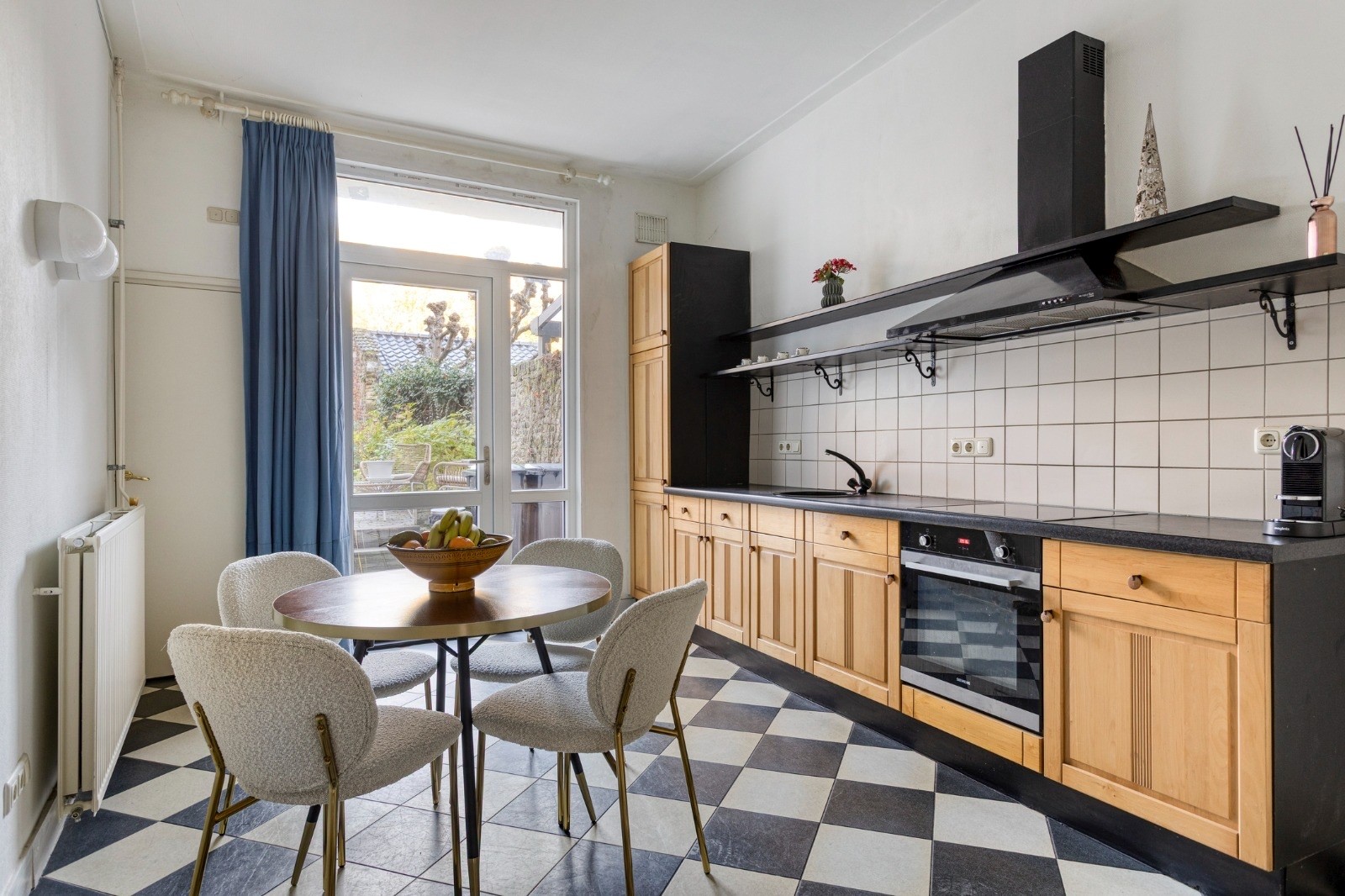 Begane grond: Entree met meterkast en prachtige terrazzovloer. Vanuit de hal is direct de trap naar de eerste verdieping bereikbaar, gevolgd door het deels betegelde toilet. Aansluitend bevindt zich de royale leefkeuken met toegang tot de wasruimte. De keuken is uitgerust met een koelkast, diepvries, elektrische oven, keramische kookplaat, afzuigkap en een praktische voorraadkast.